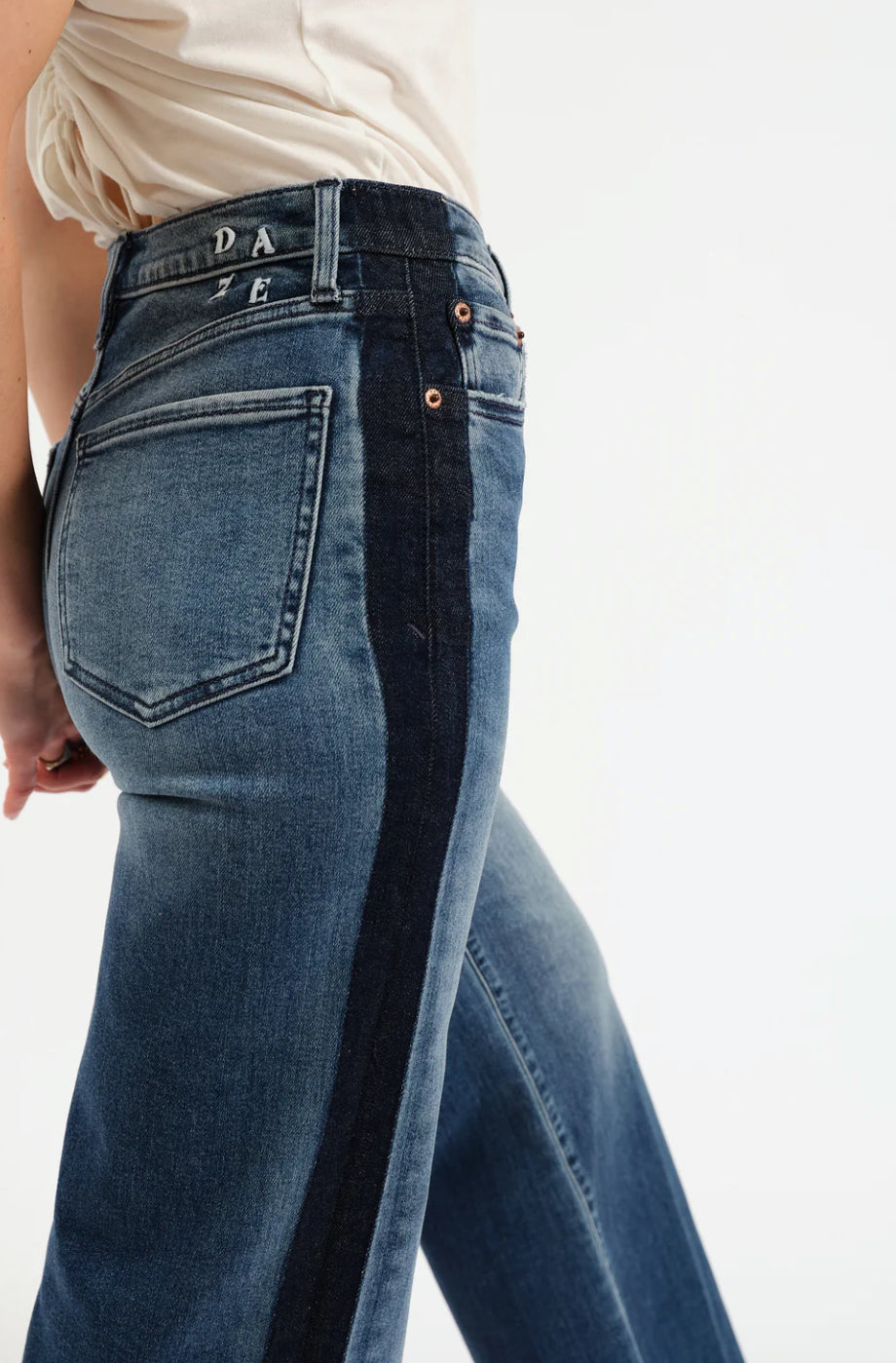 The cool girl jean just got even cooler, Far Out is a modern silhouette with black Tuxedo stripes across the sides of the legs for our take on denim tailored details. In a waist defining high rise, this wide leg is constructed in our "hug" denim that hugs your body, but has just enough weight to keep a structured fit.