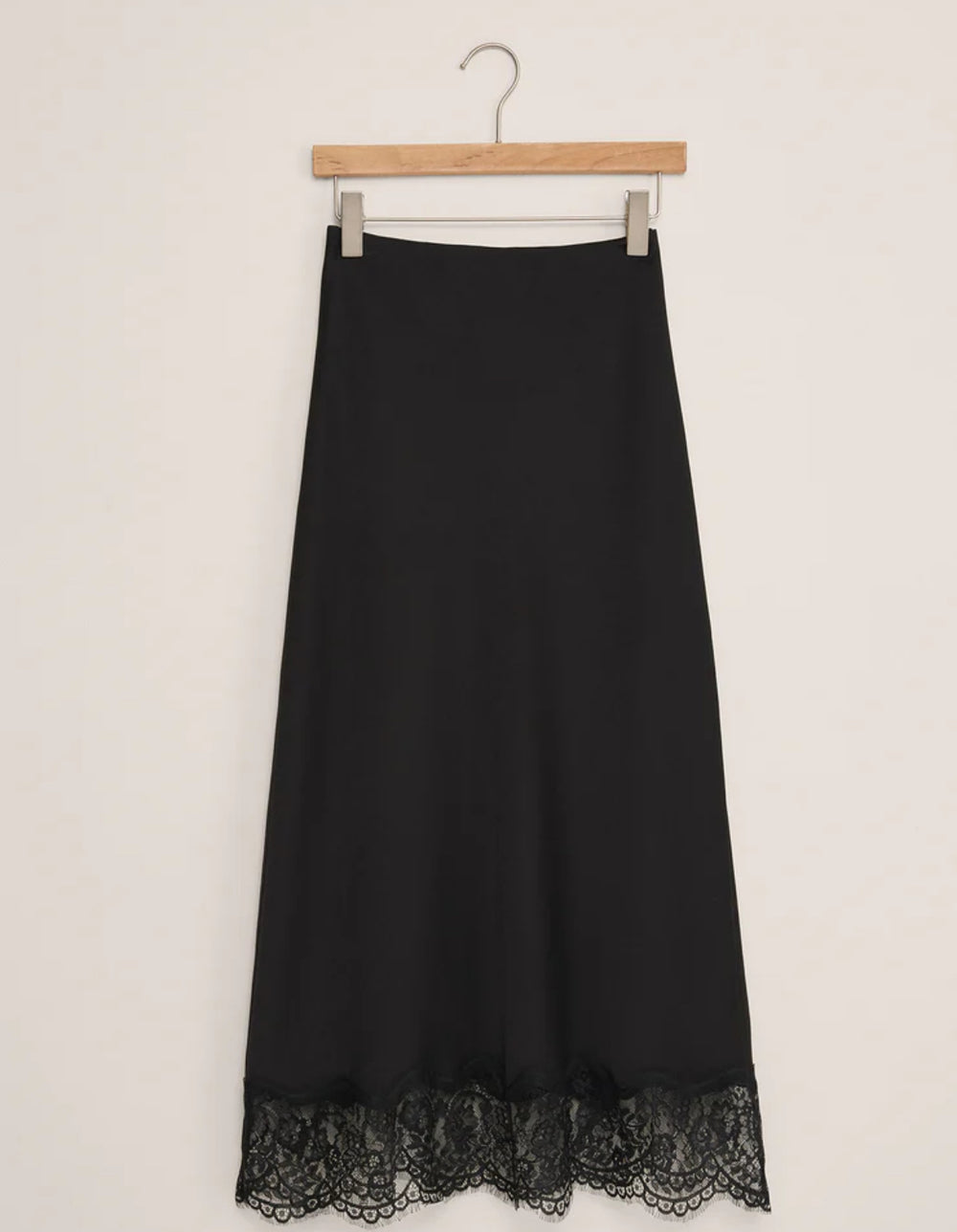 Crafted from smooth, lustrous satin, this high-rise midi skirt brings an elevated touch with a scalloped lace hem. The pull-on silhouette offers comfort and polish in equal measure, perfect for holiday dinners, cocktail hours, and everything in between.