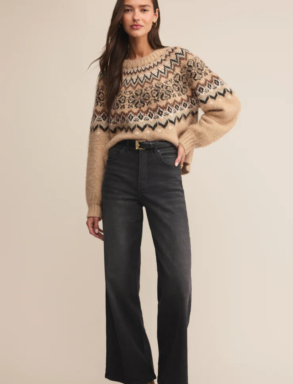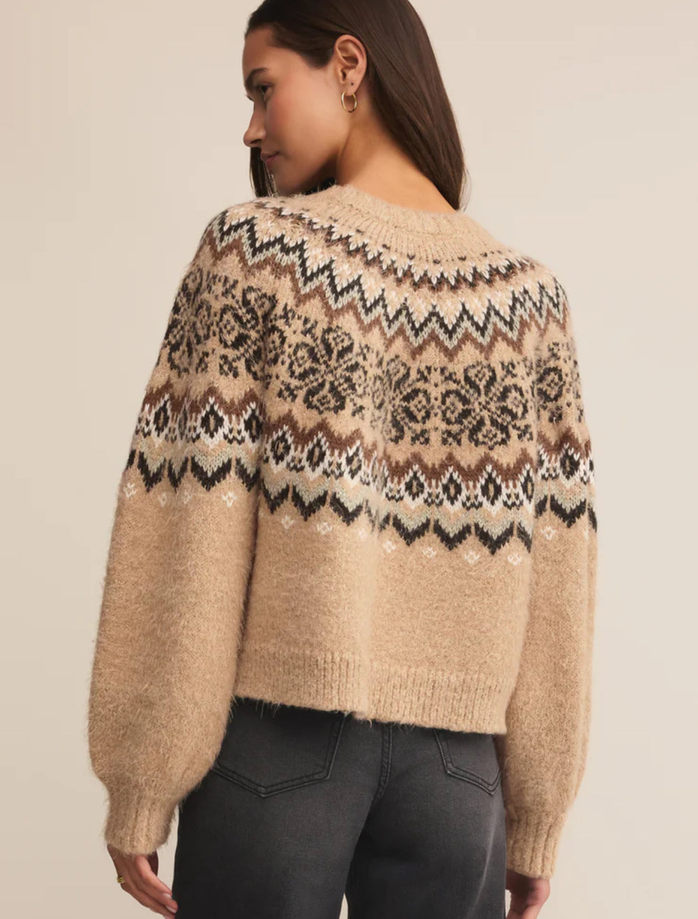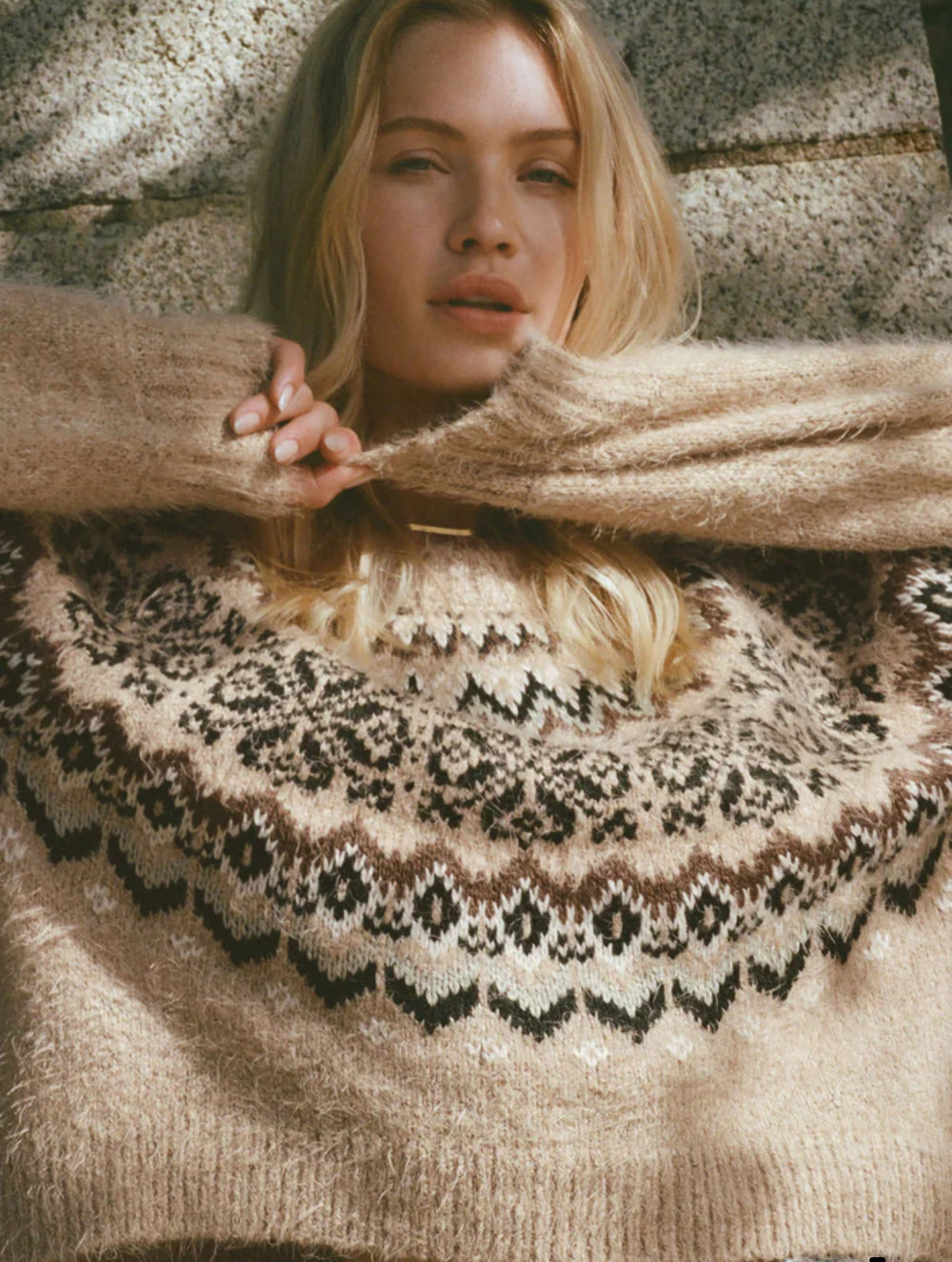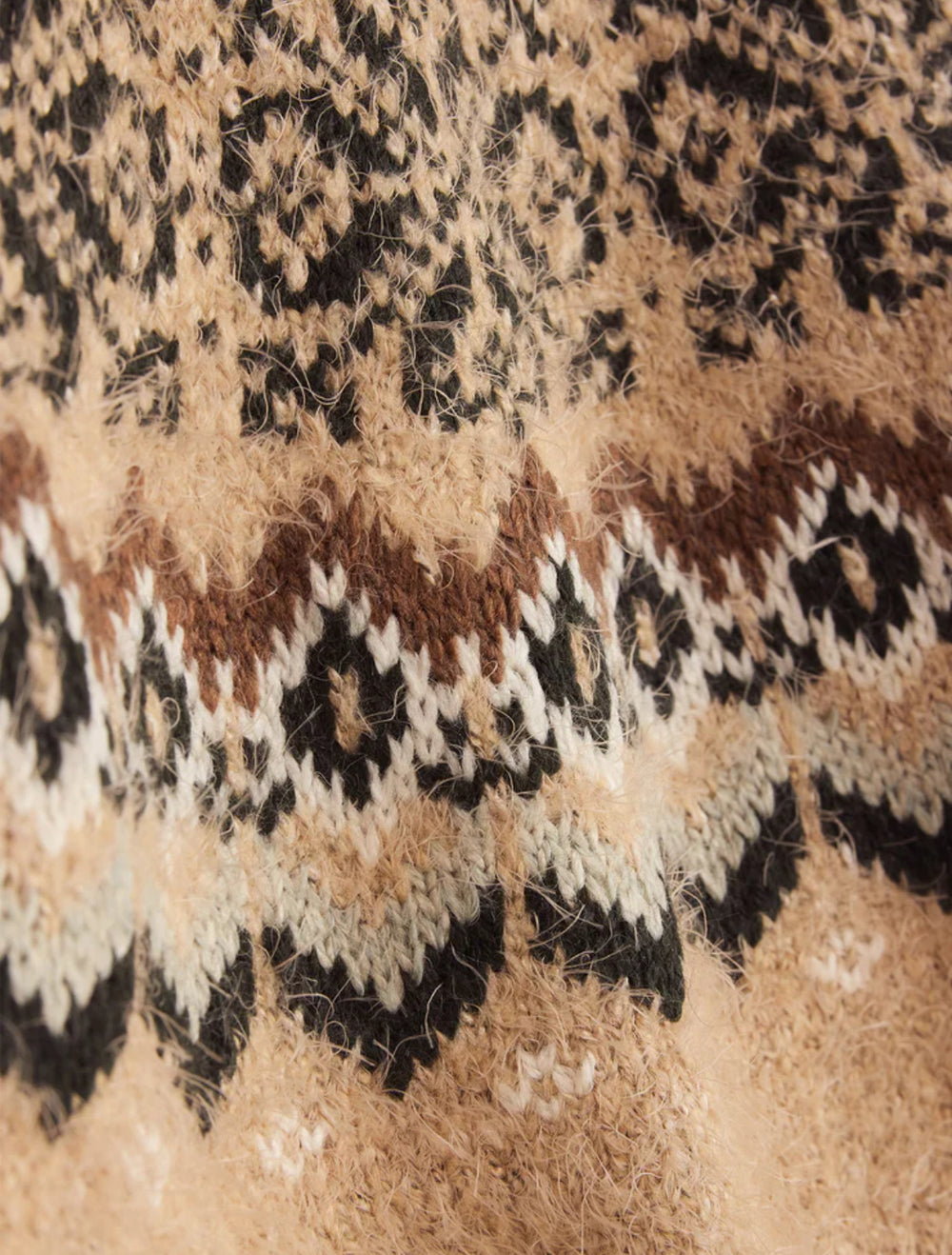 A whispy, feathered sweater knit brings an ultra-soft hand feel to this relaxed Fair Isle sweater. Designed with a crew neckline and easy drape, it’s the kind of knit that feels just as good on a snowy cabin morning as it does with denim.