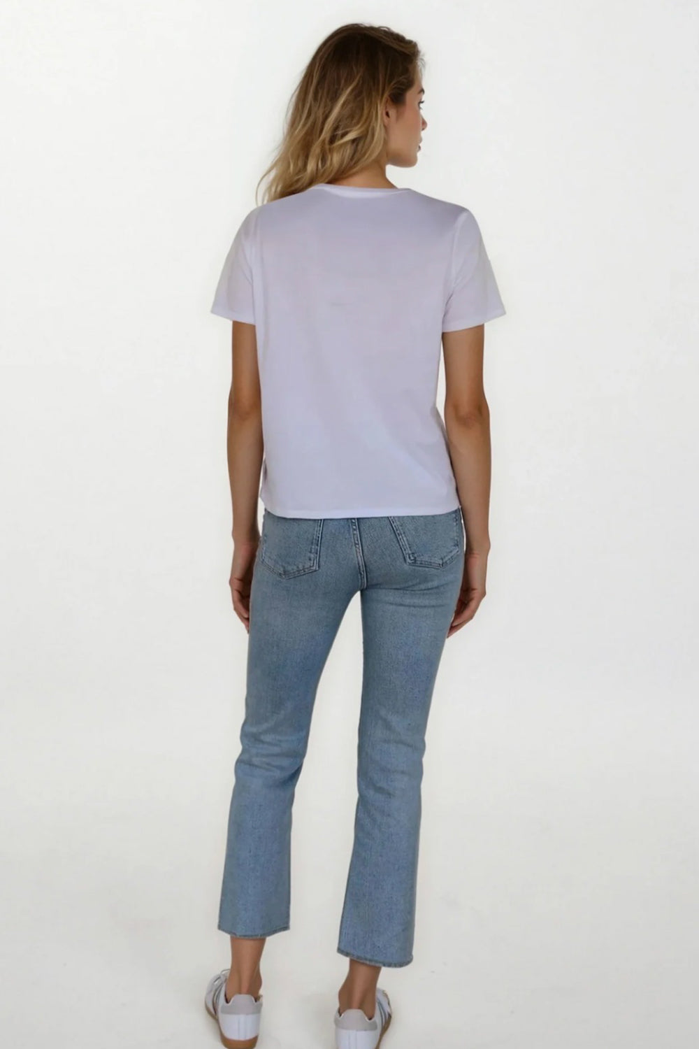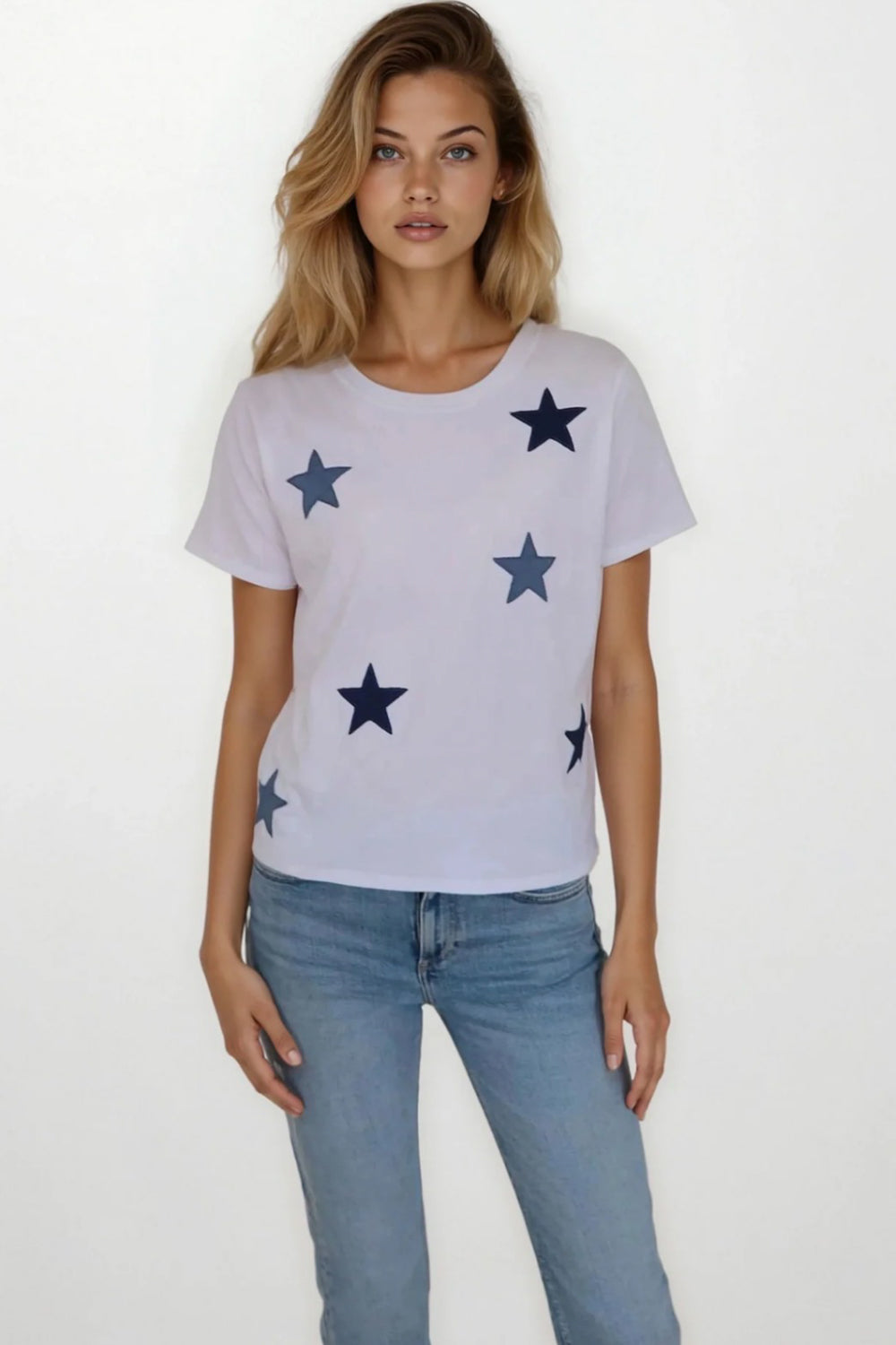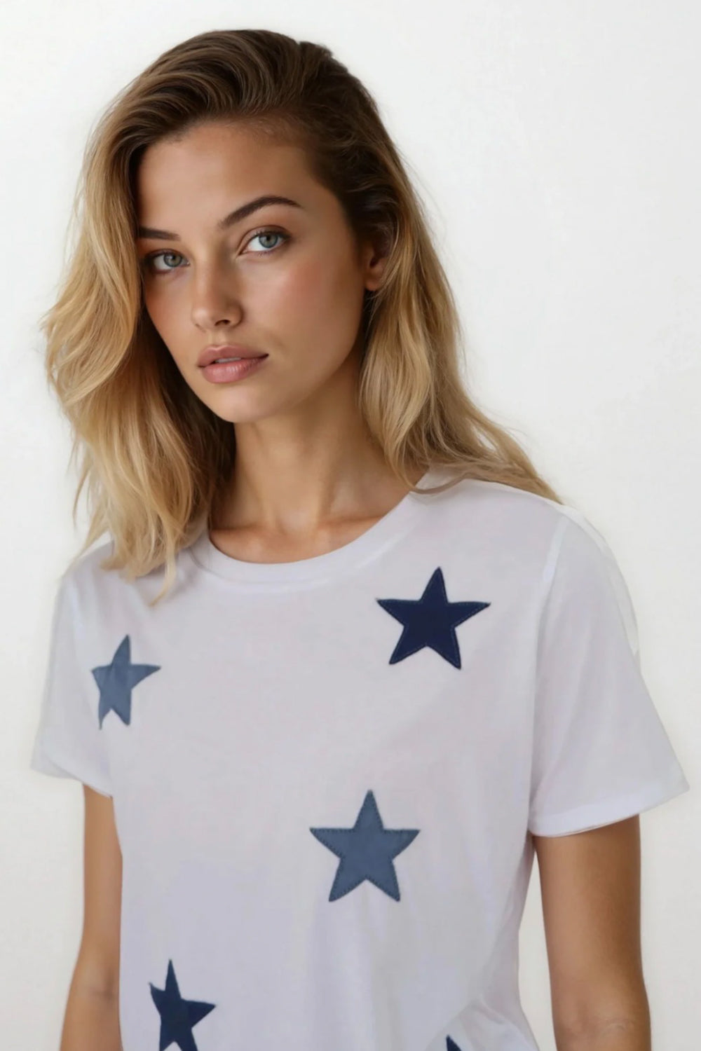Stars, but make them denim. The Denim Patch Perfect Tee takes a classic white tee and gives it a little all-American attitude. Scattered indigo star patches add texture and depth, creating that perfectly broken-in, vintage feel — like something you’ve loved for years (even if you just got it).