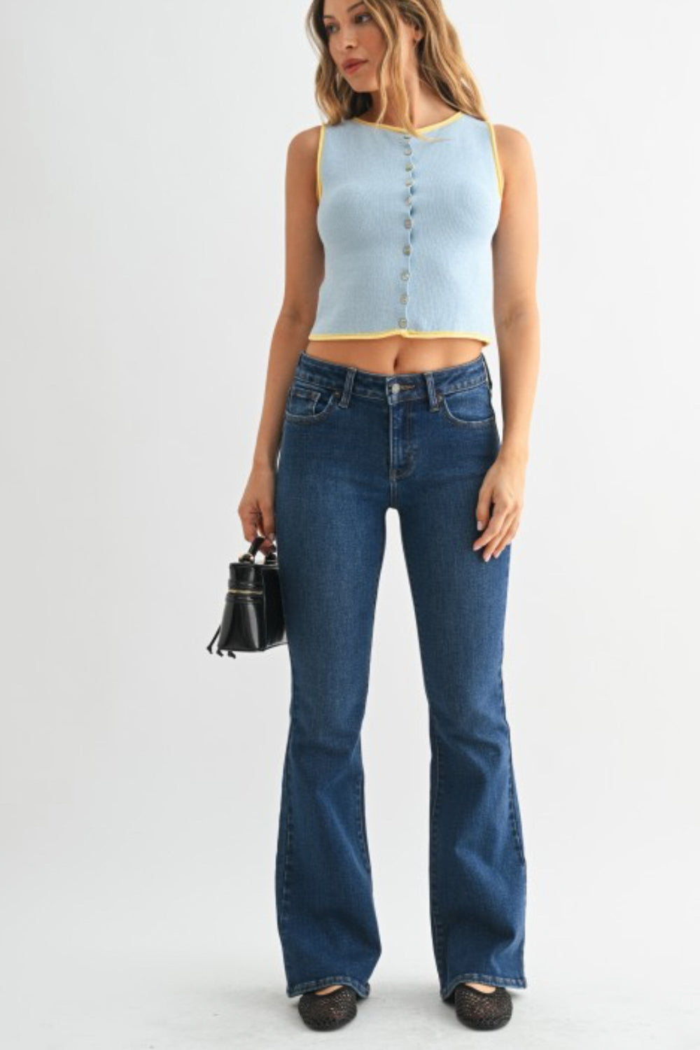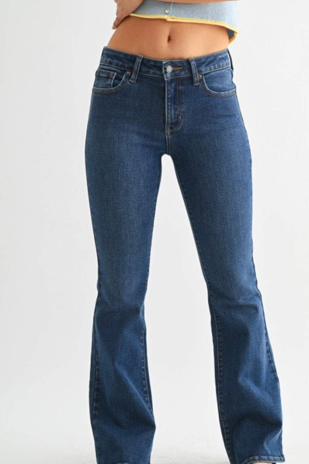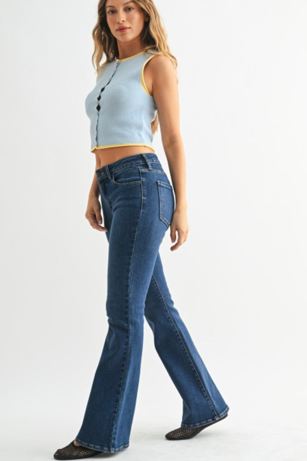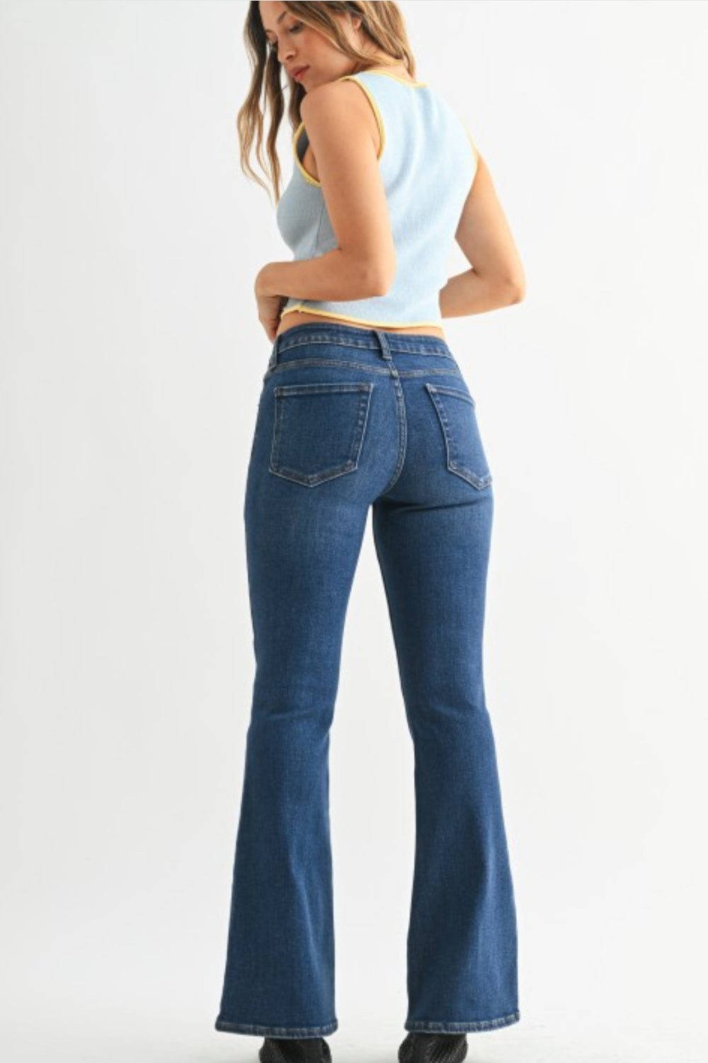 This mid-rise flare jean in rich dark denim offers a flattering silhouette that lengthens the legs and defines the waist. Designed with a comfortable mid-rise fit, it contours through the hips and thighs before flaring gracefully at the hem.