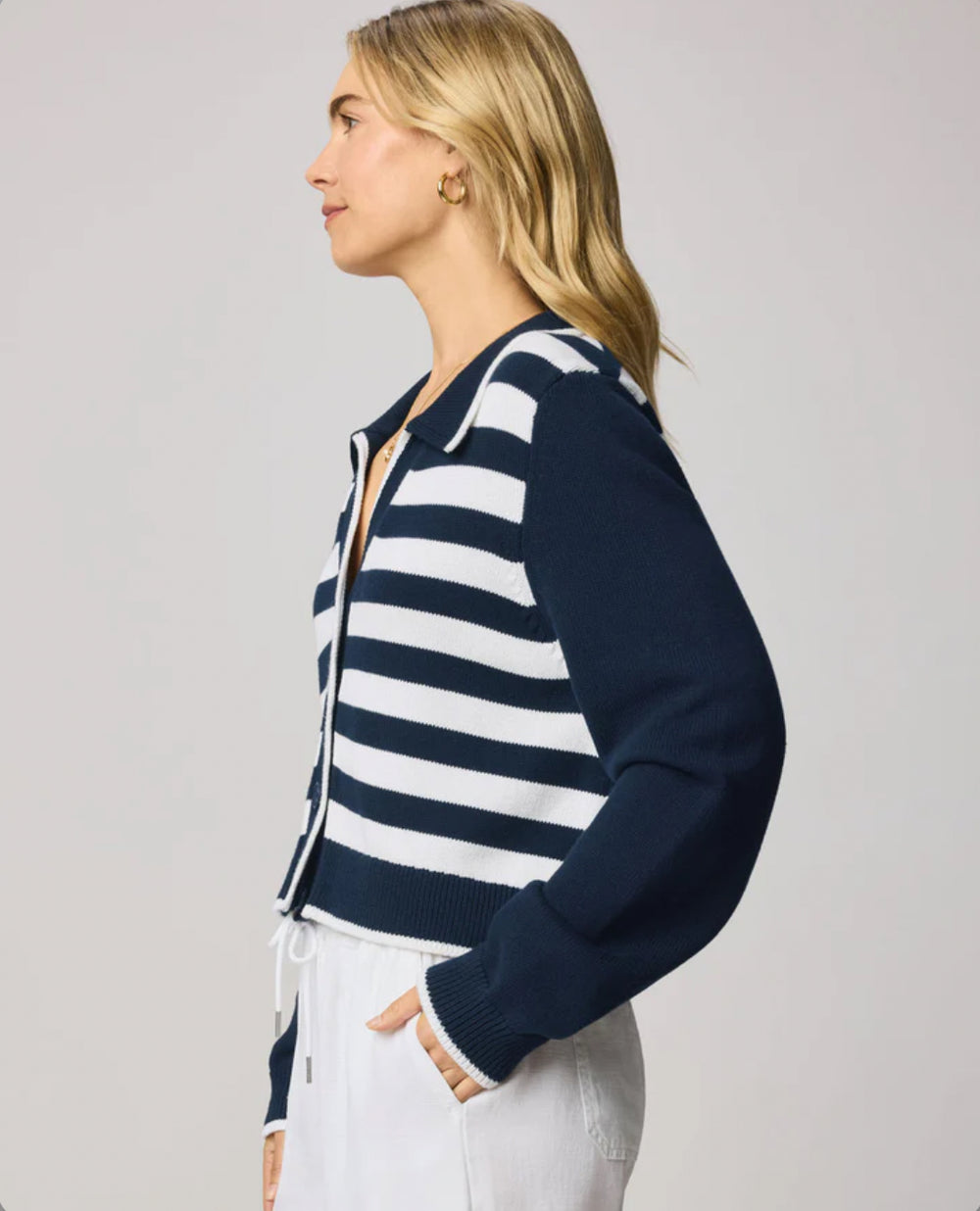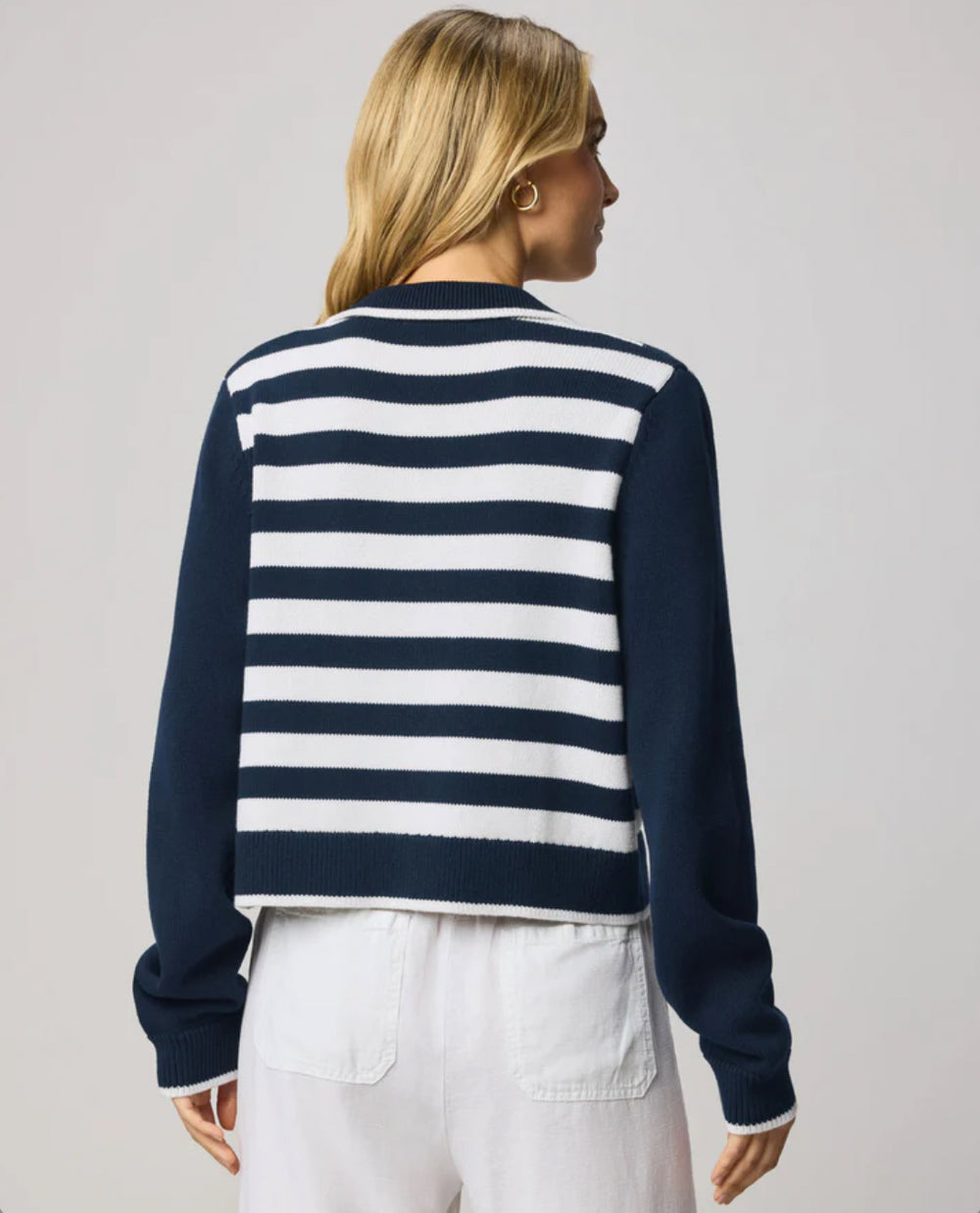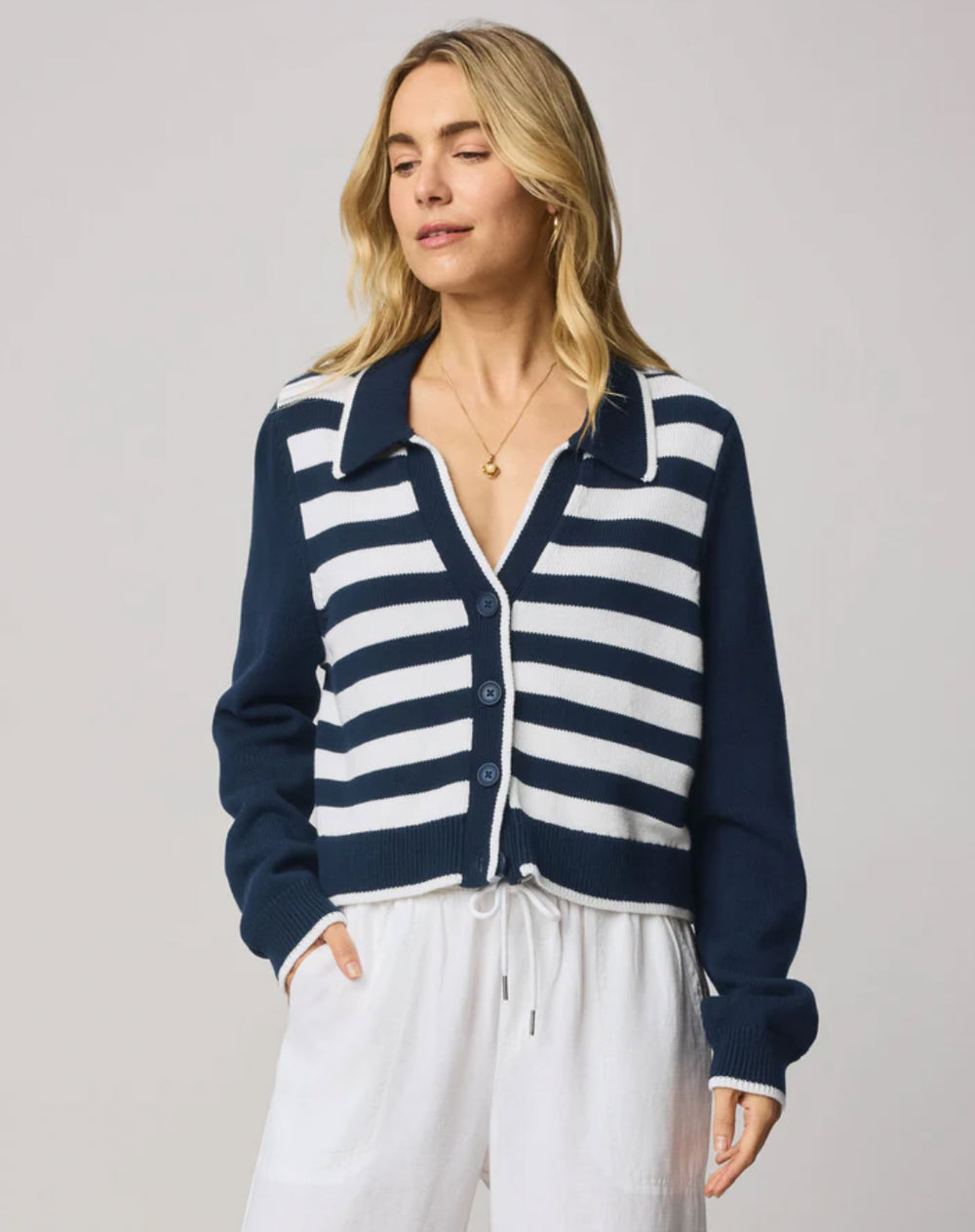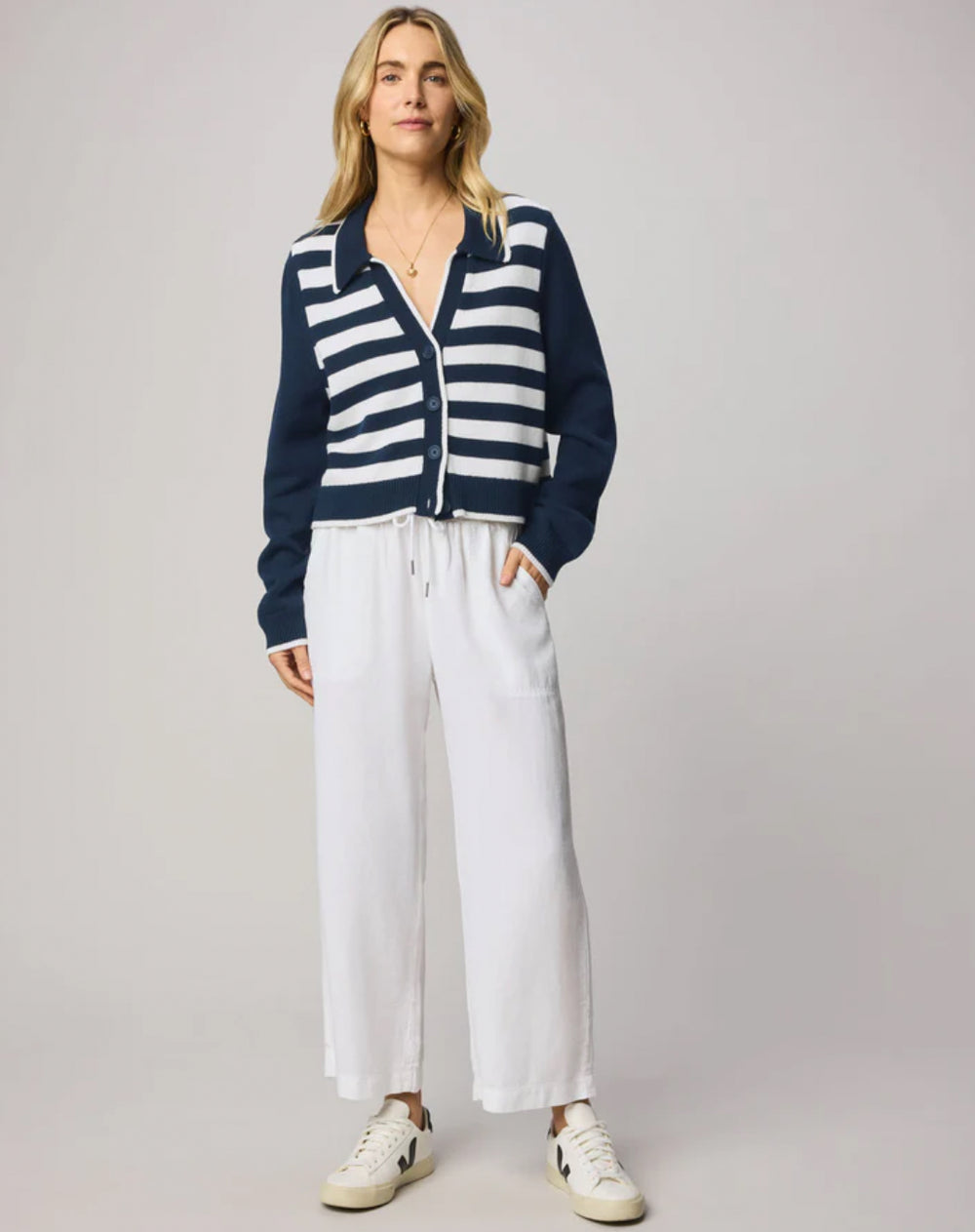 Your new favorite layer for non-stop days. This soft, slightly cropped cardigan keeps things relaxed, with an open collar and button-up front that adds a hint of polish. Contrast stripes give it a cool, nautical look we love.
