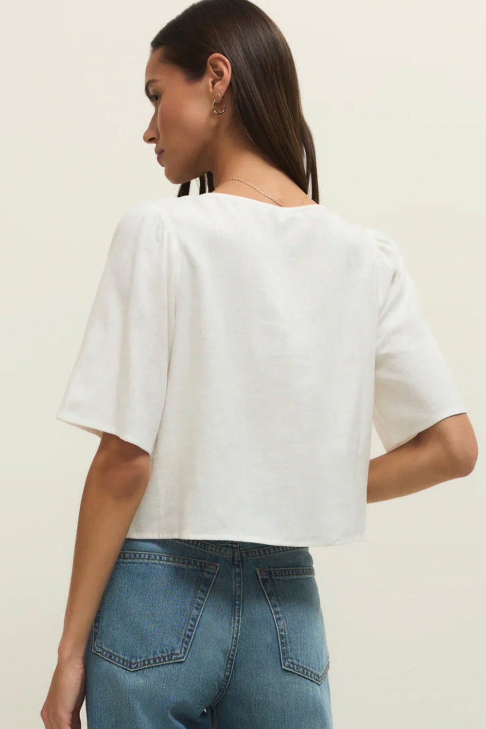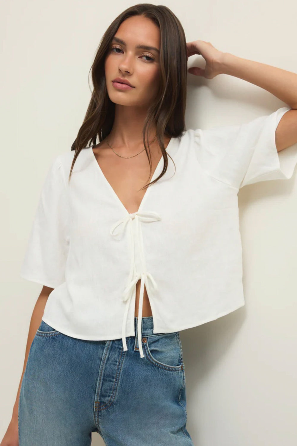 This feminine top is an instant favorite with its washed linen blend fabric, flattering relaxed fit, and tie front, finished with a modesty placket for easy coverage. Made to be dressed up or down, try it with denim or linen pants