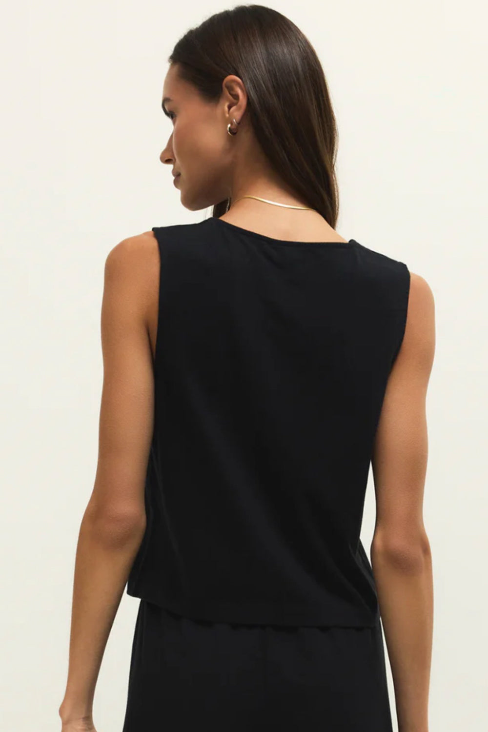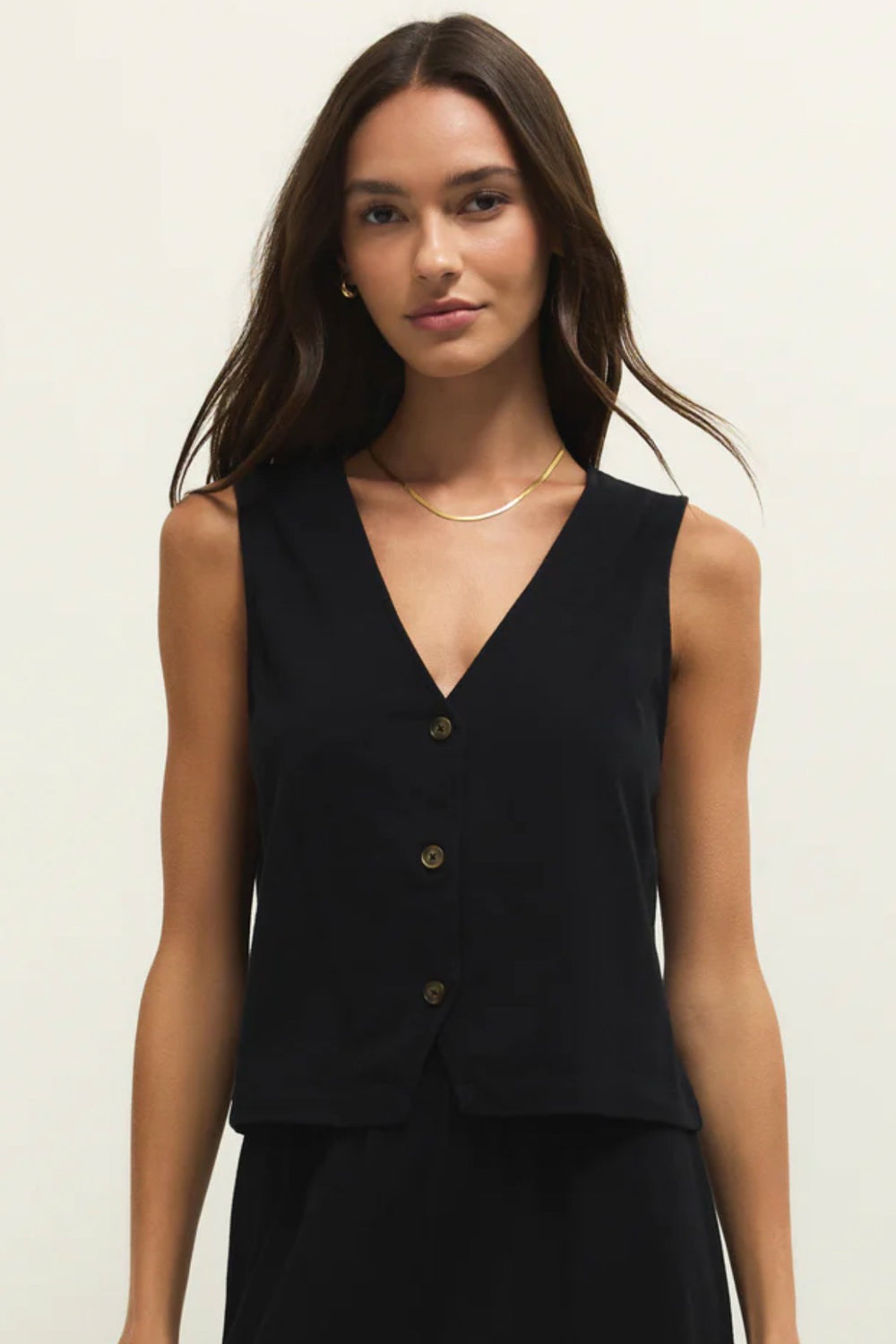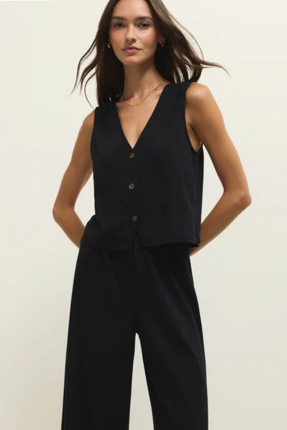 This sleeveless top will be an easy wardrobe staple with its button front, v-neck, and 100% cotton jersey fabric. Make it your go-to outfit and pair with its matching pant or wide leg denim.